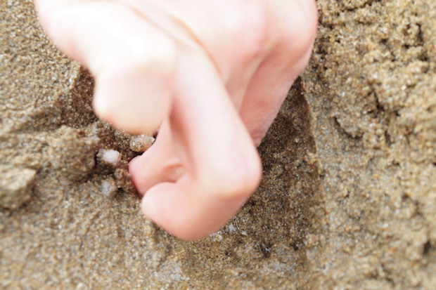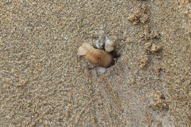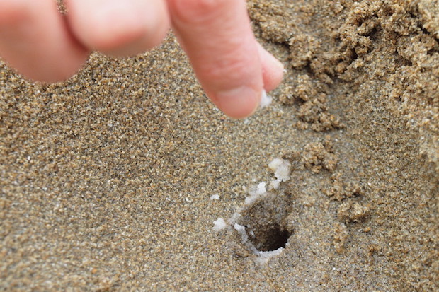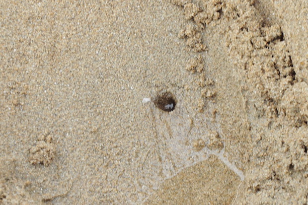 ②そこにマテガイの棲み処があれば、削った砂地にこんな穴が現れる。