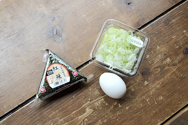 食材は鮭おにぎり、卵、ネギだけ。ネギは薬味用に売られてる刻みネギがベストだけど、フリーズドライでもOK。卵はこういった専用ケースに入れていくと割れずに持ち運びできます。