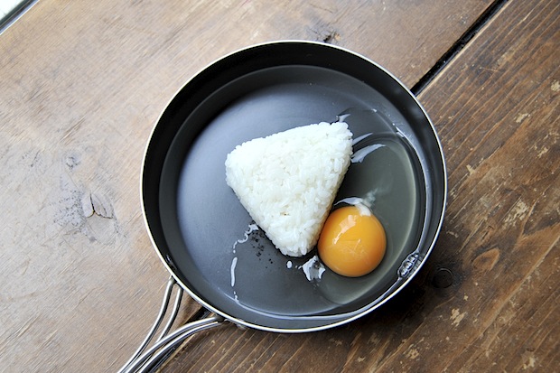 まずはフライパンにおにぎりと卵を割り入れてしまします。