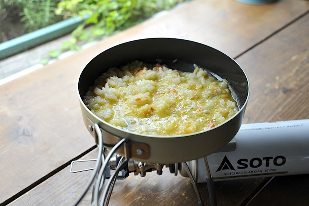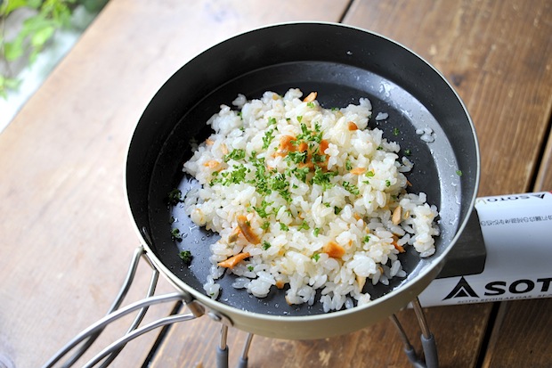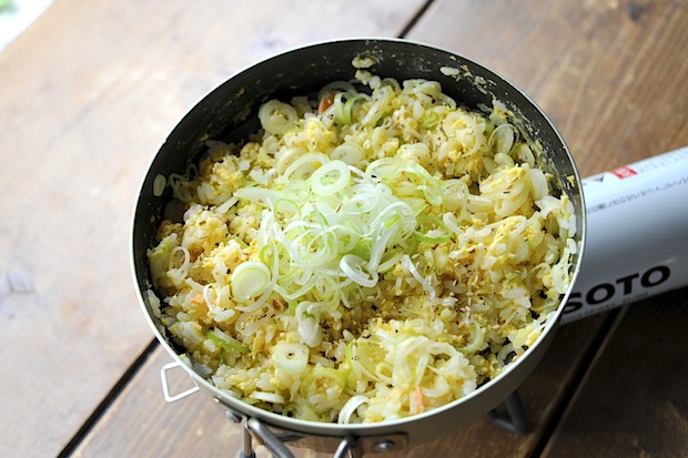 ソロで行く軽いハイクだと朝イチ電車に乗る前にコンビニでパンやおにぎり、カップ麺なんかを買っていく人も多いと思うんだけど、もうちょっとだけ手を加えてあったかくておいしい食事を山で食べたくない? そこで「コンビニ食材を利用した山ごはんレシピを紹介していこう」というのがこの連載。前回同様コンビニおにぎりを活用した超簡単レシピですが、今回はフライパンで作る「炒め系レシピ」をご紹介。