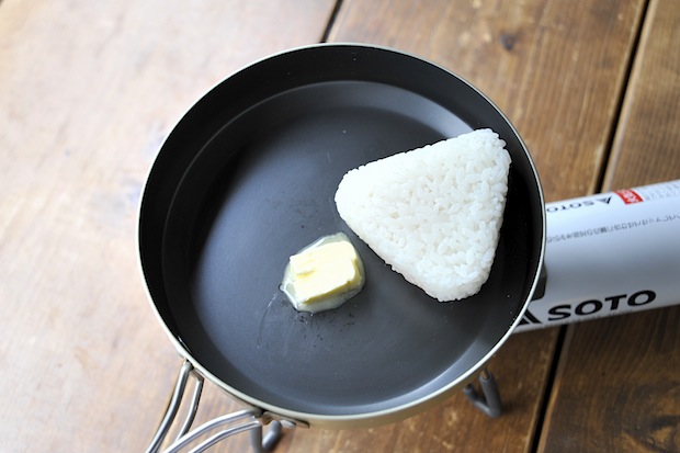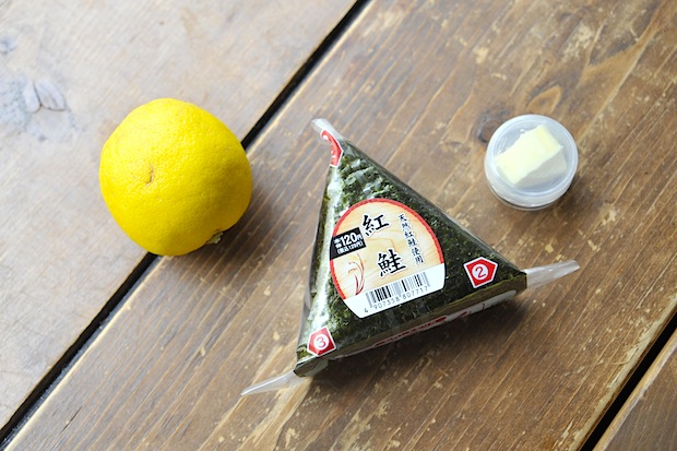 食材は鮭おにぎり、バター、レモン。バターの持ち運びは100円ショップの化粧品用クリームケースが便利。もちろん小包装のものでもOK。