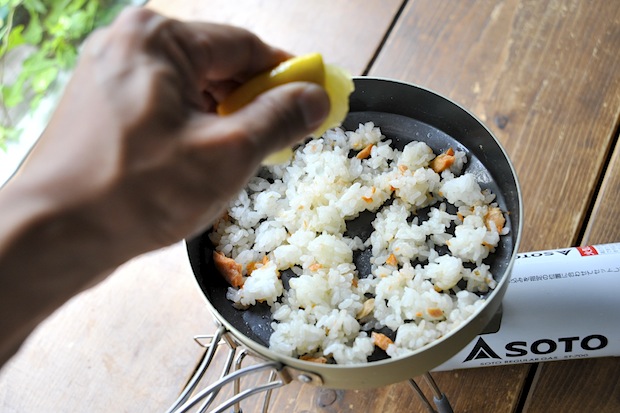 バターが溶けきってきれいにおにぎりの形が崩れたら、レモン1/2を絞ってさらにかき混ぜて水分を飛ばします。