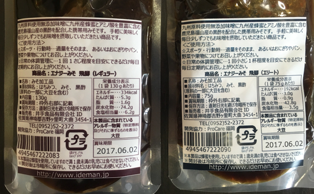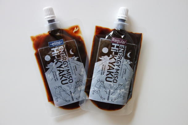 パッケージは2種類。左のエリートは短い期間で食べきれるように容量を75gと控えめにした小型版。二つ折りにすればジェルポケットサイズにもおさまりますから、トレランやハイキングの途中、適量をなめるのもオススメです。実際、ファストハイキングに持ち出しましたが、味噌の塩気と旨味、ハチミツの甘さ、黒酢の酸味は単調になりがちな行動食に大きな変化を与えてくれました。パッケージの形状からジェル的に摂るものだと勘違いしてしまいそうですが、あくまでも「味噌」です。勢いよくちゅーっと吸うべきものではないことを書き添えておきましょう。