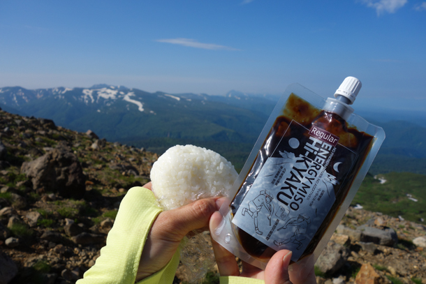 まずは山に持ち出しておにぎりで試食。この日は北海道最高峰の旭岳へ。きれいな景色を眺めながら目先の変わった味を楽しめば、登山の疲れも吹き飛びます。小さじ半分ほどで、おにぎり一口をラクにカバーしてくれる美味しさ。さらに歩いていて口寂しくなったら、そのままペロリとひとなめ。夏なので衛生を保つため、適量をなめる時には指先にとって、という作戦をとりました