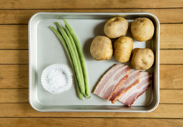 4、食べやすい大きさにカットしたベーコン、インゲンをボウルに入れ、ジャガイモを加えて燻製した塩を全体に振って和える。仕上げにブラックペッパーを振る。