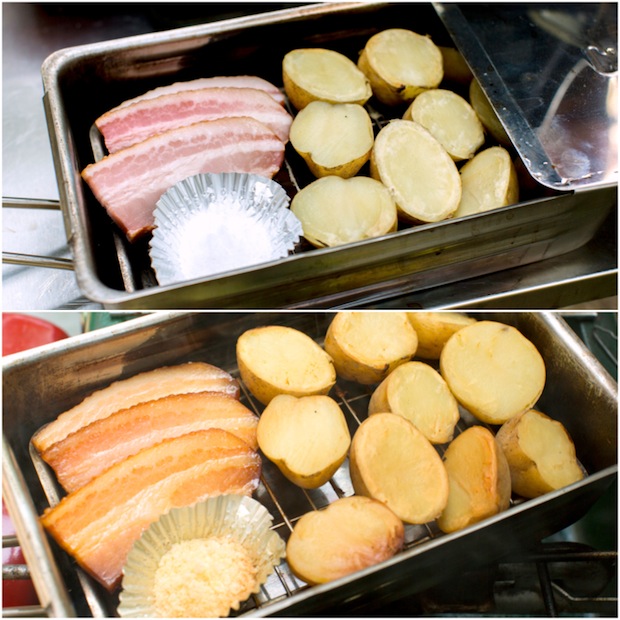 3、お湯を捨てて空焚きで5分間ジャガイモをロースト。いったん取り出し底にチップを入れ、ベーコン、銀紙カップに入れた塩を網に並べる。強火で熱し煙が出たら中火の弱火で10分ほど燻製する。