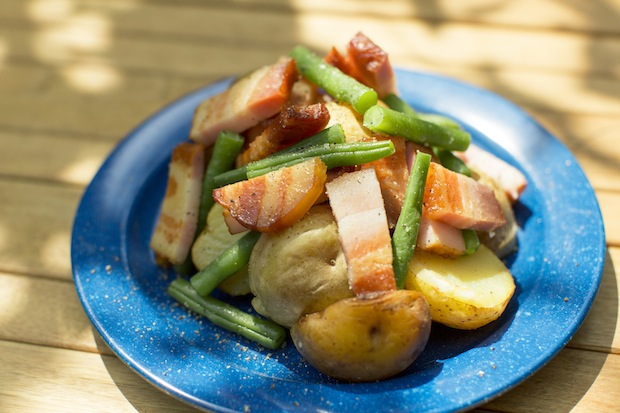 蒸してローストし、燻製まで1台でできてしまうキャメロンズスモーカーの実力をフル活用したレシピ。豪快にカットしたジャガイモやベーコンを大皿に載せ、大人数で囲んでください。