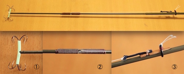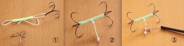 ①左右の穴からループ状に糸を引き出し、イカリ型にした鉤をループにかける ②鉤を両側に付け、ループを引き絞って鉤の軸をゴム管に挿入。糸を片側だけ伸ばして貫通穴の所で結び留め、残した糸に結びこぶを作る ③装着のイメージ。中空の棒の先端から出る糸はループにしておき、チチワ結びで結びこぶを留める