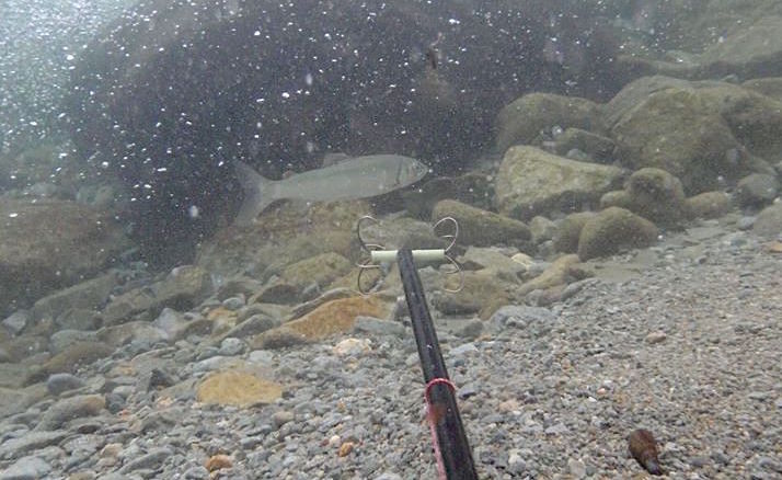 アユにほんの少しでもかすれば、がっつり鉤がかり! ヤスと比べて軸が細いので、アユの身を痛めません。両掛鉤は焼きが硬めに入っているので、岩を突くうちに折れてしまいがち。しゃくりの仕掛けは多めにつくっておきましょう(写真提供=エソ☆マスター)