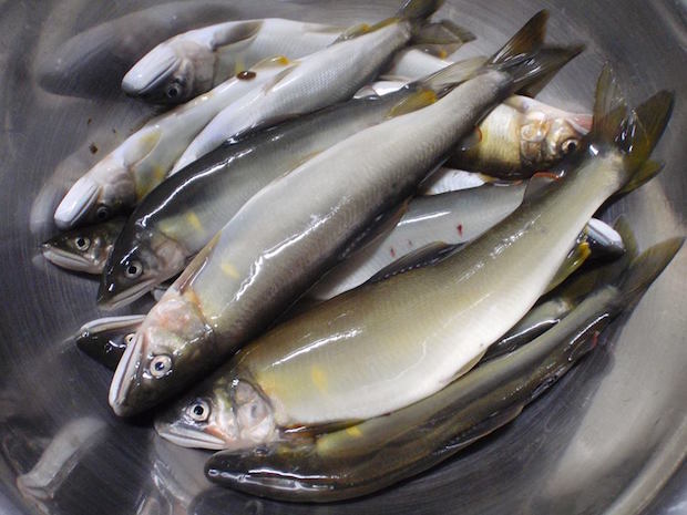 パツンと身のはった盛夏のアユ。これは初めて突きじゃくりを手にした友人の漁果。勘が良い人なら、初めてでも一家の食卓を賄う程度は獲ることができます(写真提供=エソ☆マスター)