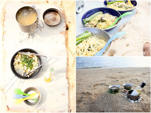 調味料とちょっとした野菜とパスタで、簡単ですけれど充実したごはんがいただけます(私はワイン付きで!)。写真のように、海で落ちている木の板や大きめの流木があれば、その上に調味料やお皿、グラスをのせると砂がいっぱい付かないのでよいです。