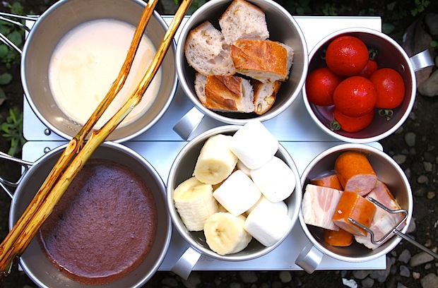 フレンチトーストの液(今回はチョコとプレーン)とパン、それに焚き火で炙るとおいしくなるものを準備します。