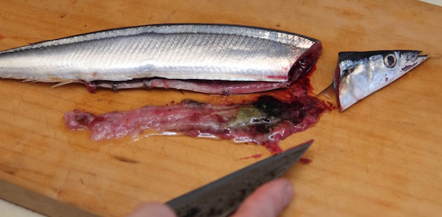 胸ビレの後ろでちょこんと断頭。そのまま肛門まで開いたら包丁でワタを掻き出しましょう。ワタは小皿にとりおき、腹の中は流水できれいに洗います。写真のワタの鮮度は「可」といったところ。新鮮ものは、もっと各々の臓器がはっきりしています。そして、ワタの色はそのときサンマが食べていたものの色になります。鮮やかなオレンジのときは甲殻類の子供を食べていた証拠。そんなワタは抜群に美味!