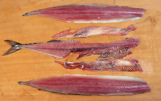 洗ったサンマは大名おろしで3枚に。中骨に残った身もあとで使うので、過度に丁寧に処理しなくても大丈夫。身に残った腹骨は、腹ビレと一緒にそぎ落としましょう。中骨、腹骨も捨てずにとりおきます。