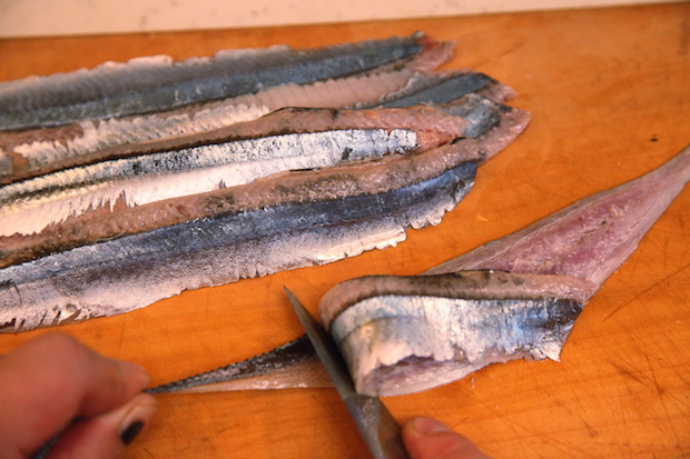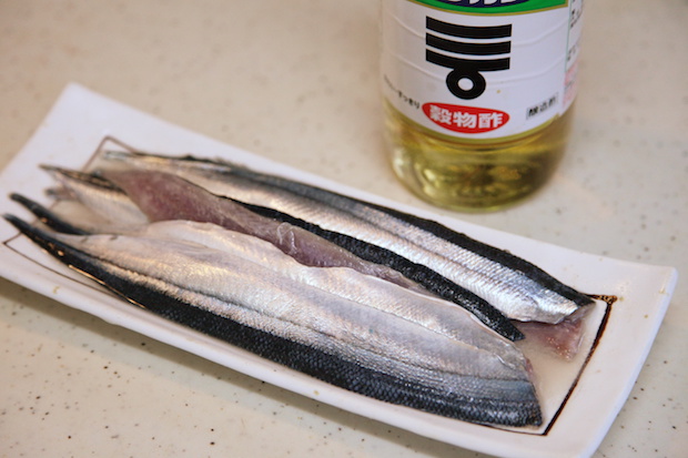 おろした身は、軽く塩をして5分ほどおき、続けて酢で全体を漬けつつ洗う。酢で洗うことで皮がしまり、はがしやすくなる。気が短い人はこの手順はサボってもOK。