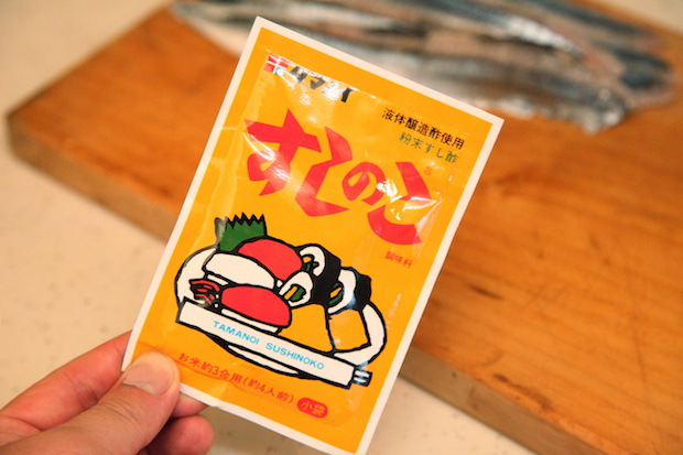 アウトドアで寿司飯といえば、使うべきは「すしのこ」! 醸造酢を粉末状にしたもので、米の飯を水っぽくすることなく酢飯へと変身させます。通常、寿司飯を作るときは追加する寿司酢の分だけ水を減らして米を炊きますが、ストーブや焚き火で米を焦がさずに固めに炊くのはちょっと難しい。その点、水気の増えないすしのこを使うと炊飯を失敗しづらい。
