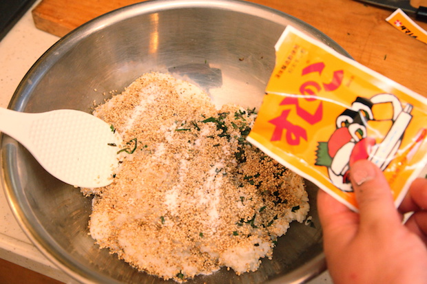 炊き上がった米に白ごま、薬味(大葉など)、すしのこをいれて混ぜる。