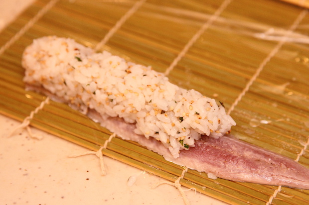 巻き簾の上にラップを敷き、皮側を下にしてサンマを配置。酢飯を細長い俵形に載せたあと、ラップで包んで巻き簾を握って整形する。形を整えたらクーラーでしばし静置する(冷えると寿司飯がまとまる)。