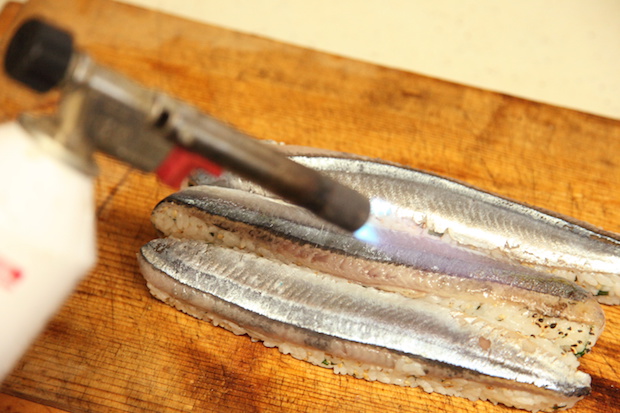 米が冷めて固まったら、トーチでサンマを炙る。皮目から黄色い脂が吹き出し、香ばしい香りが漂ったら、包丁で食べやすい大きさに切り分ける。炙るときは焦げても問題のないまな板を使いましょう(陶器の皿を使うと割れることがある)。