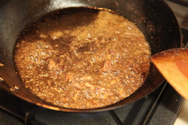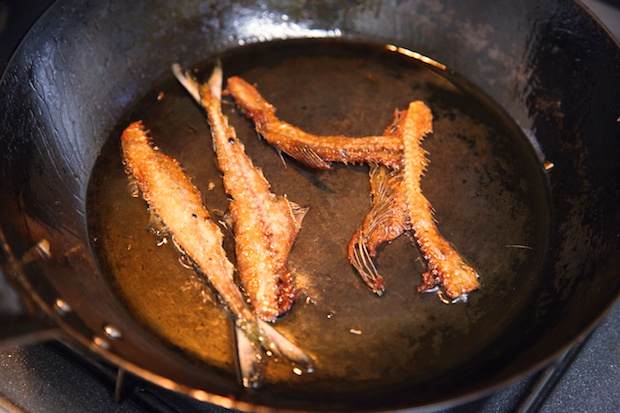 中骨と腹骨を入れ、柔らかくなった身を骨からはずす(写真は火を入れすぎました。身が白くなる程度のタイミングで!)。