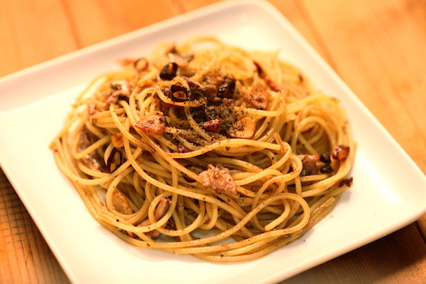 皿にもって完成! 味は普通のペペロンチーノとアンチョビのパスタの中間のような感じ。大人向けのほろ苦い味わいです。ひと口食べたら脳がビールを要求するので、ビールを冷やしてからのぞみましょう。ペペロンチーノとしては邪道ですが、私はコショウが好きなのでコショウをしゃらっと振ります。