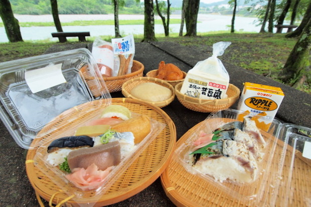 とくにおもしろいのがスーパーの鮮魚部。ウツボのタタキやチャンバラ貝(正式名称マガキガイ)など他県民には謎の魚介が並ぶなか、横綱級の存在感なのがサバをまるごと1匹使った尾頭付きの姿寿司(画像のような少量パックもありだがからご安心を)。柚子酢の酢飯がさわやかだ。炭火であぶるとさらにおいしくなるので、高知キャンプ食の王様であろう。