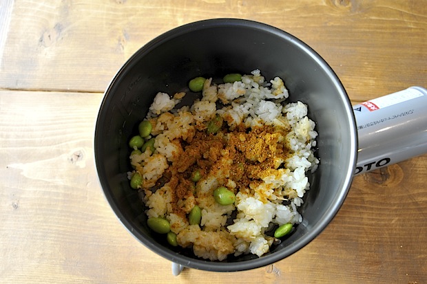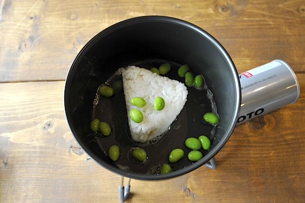 ベースに使うおにぎりはツナマヨです。コッヘルにバターを落としてほぐした枝豆を適量とおにぎりをのっけます。