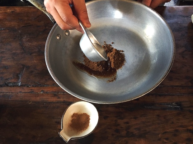 ①フライパンに黒糖と水を入れてかき混ぜる。