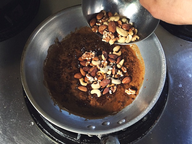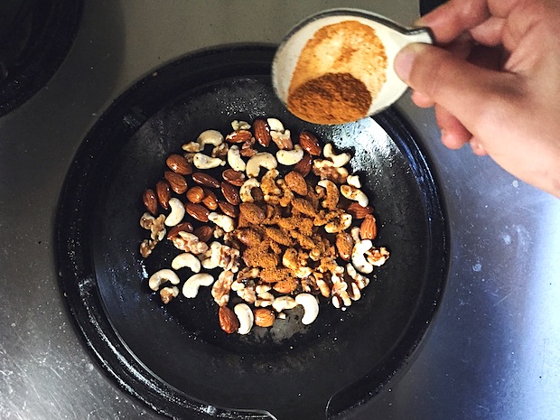 ⑤カラメルがミックスナッツに絡まり、もったりとしてきたら弱火にしてかき混ぜ続ける。途中でシナモンパウダーをふりかける。