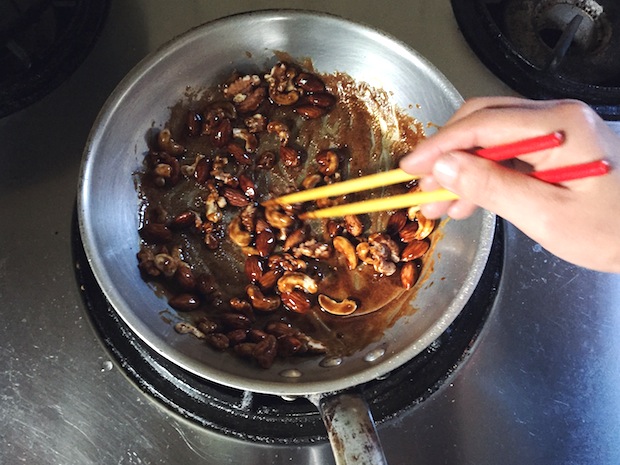 ⑤油でピカピカしていたナッツが次第に油となじんできたら火を止める。