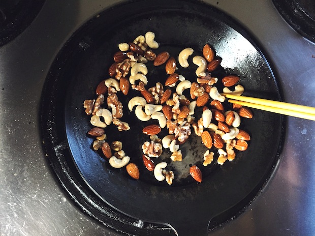 ①フライパンにミックスナッツと油を入れてかき混ぜる。