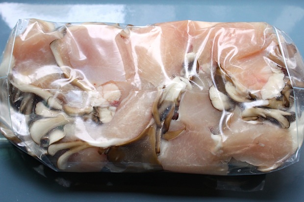 1、鶏むね肉は、大きめのひと口大に切り、舞茸は石突を取りバラバラにほぐして鶏肉とともに保存用袋に入れ、塩、酒を加えよく混ぜ、空気を抜いて口を縛る。これを2時間以上寝かせておく(できれば1晩がベスト)