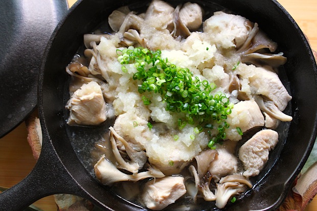 舞茸と鶏肉のうまみたっぷりのおつゆがあふれ、胸肉とはおもえないぐらいふっくら柔らかいお肉に大根おろしが効いています。こんなに簡単なのに、驚く程おいしいです(自画自賛で・・・すみません)。これは、舞茸が本当にいい仕事をしてくれます。水の量を足して、昆布を入れれば鍋物にもよいです。里芋やら揚げたお餅やら、おうどんやらをいれてもおいしいのです。そして何よりこれには日本酒が間違いなさそうです!