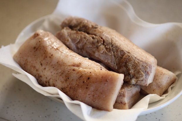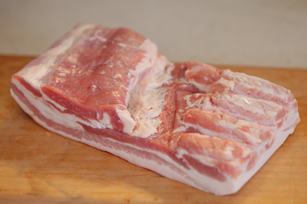 いわゆる「ベーコンらしいベーコン」を作るなら、買うべき部位は豚のバラ肉。赤身の部分は製作中に縮んでしまうので、脂身が少ない肉がおすすめ。写真のものはちょっと脂身が多めです。