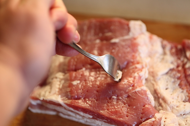 肉を常温に戻してから、塩が身の中まで染み込むようにフォークで肉に穴をあけます。内側、外側の両面からしっかりと!