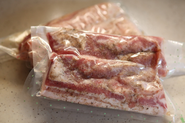 熱に強いタイプの保存袋に入れて脱気。この状態でおく時間の長さで、塩気が変わります。せっかちさんはすぐに次の手順に進んでOK。