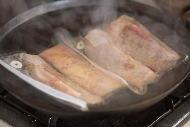 大鍋に75℃前後のお湯を沸かし、袋ごと肉を投入。肉の中心温度が75℃に到達する時間を1分以上もうけ、肉を殺菌します。合わせて、塩分を肉のなかに染み込ませます。湯温の調整は、熱湯を継ぎ足して。炎で加温する際は必ず袋を一度取り出してください。そのまま加温すると鍋肌についた袋が溶けることがあります。湯温が高すぎると、ここでただの塩辛い茹で豚になってしまうので注意。