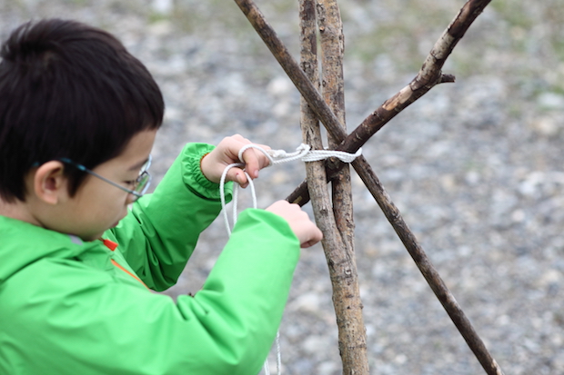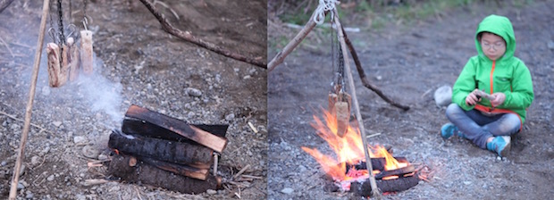 ①〜⑥まではおでかけ前夜の作業。キャンプ場に着いたら適当な枝で三脚を組み、火を起こしましょう。