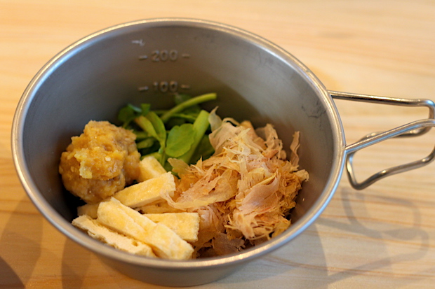 残り物の具材をちょちょこっとちぎったり切り(簡単なものはハサミでも!)、あとは熱湯を注げばほぼ完了。お湯を沸かしている間に、具材を準備しても余裕で作れます。