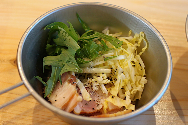 出汁と言ってもわざわざ出汁をひくのではなく、出汁となる具材をさらに加えること。例えばこちらはべーコン。