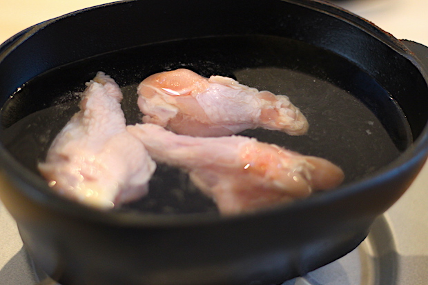 前日、夕飯の仕込のときに鶏肉(できれば骨付き)をやや多めの塩でマリネし、ひと晩置きます。それを軽く水で流して、厚手のお鍋で30分程コトコト煮ます。