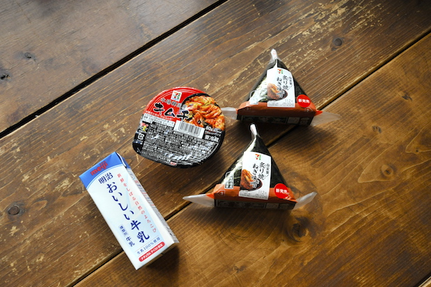 用意するのはキムチ1パックと牛乳1パック(200ml)、それとおにぎり2個。