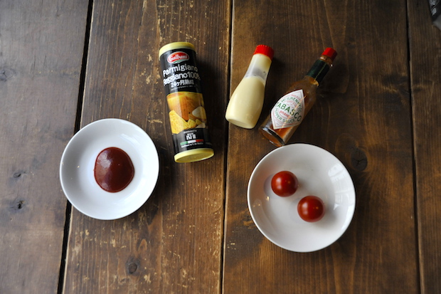 それとケチャップ、マヨネーズ、タバスコ、粉チーズ、そして持って行ければミニトマトを何個か。ミニトマトあると見栄えも味もすごくよくなりマス。