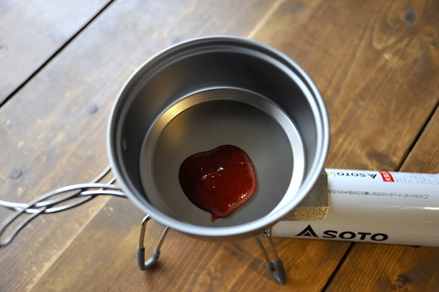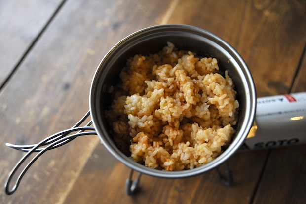 まずはケチャップを大体大さじ1くらいとおにぎりをコッヘルにあけて加熱しながら崩していきます。