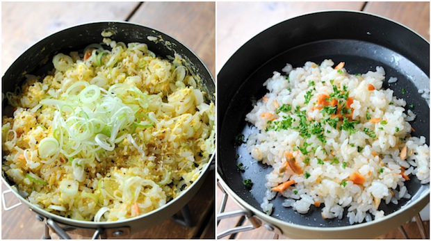 この回は鮭おにぎり・卵・ネギのみという「簡単鮭チャーハン」と、鮭おにぎり・バター・レモンを用いた洋風の「鮭バターレモンごはん」の2品。卵やバターなど食材の持ち運びについても言及している。