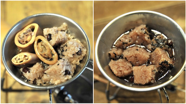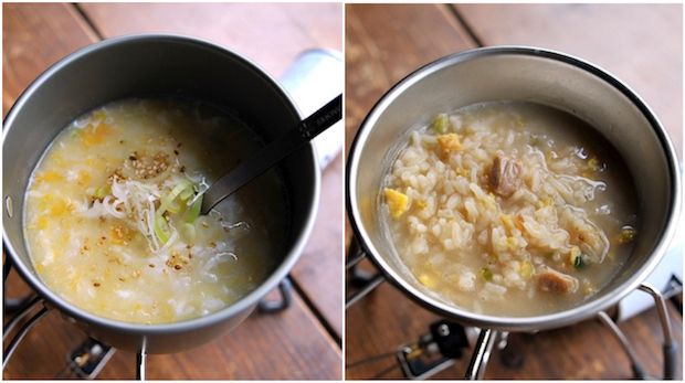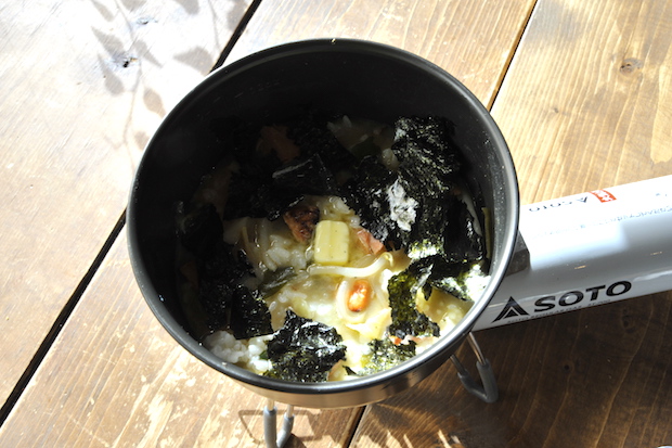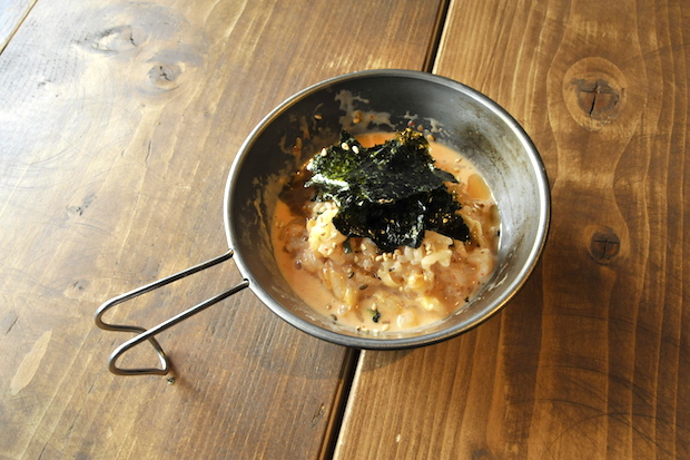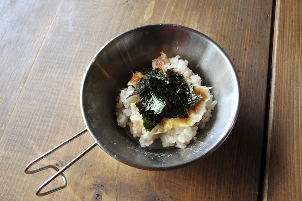 ひとつ目はタラコおにぎり・卵・ネギ・そして鶏ガラスープの素からなる「簡単中華雑炊」。タラコと卵というエネルギーの掛け合わせ的レシピで、山頂で食べたら満足すること間違いない。が、驚きはふたつ目。なんと「○○おにぎりだけを○○するだけ」…というこれ以上シンプルにしようがないほどの荒技が繰り出されるのである。