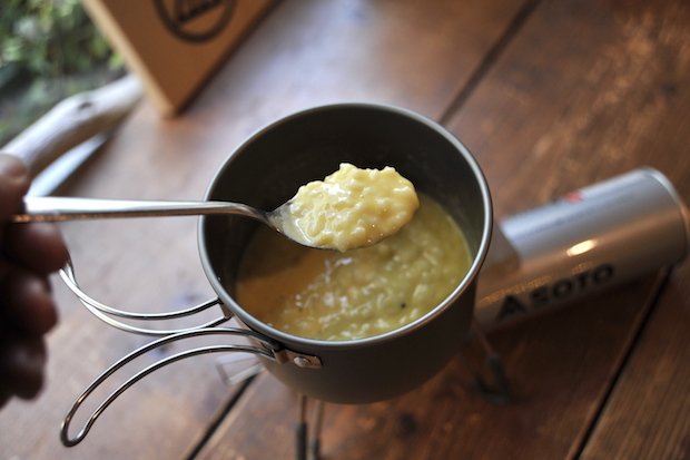 21回のなかで何度か究極に簡単すぎて泣けてくる「ザ・ものぐさごはん」が登場するが、この回はまさにそれ。山頂での時間がほとんどない時にでも、瞬時で調理できるリゾットである。