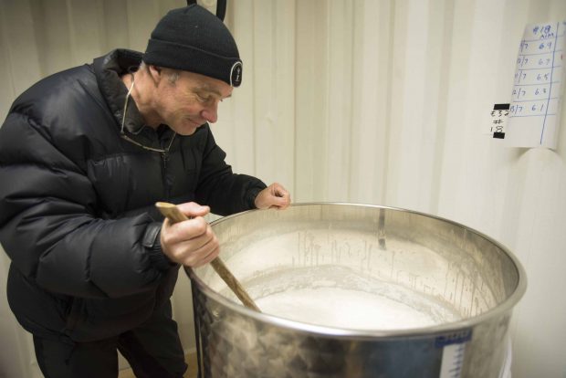 「ここにあるのは、吊るし搾りと言って、もろみを木綿の袋に入れて木の棒に吊して、自然に落ちてくる滴でつくる製法なんです。通常は、桶に入れたもろみに重しを乗せて絞り出すんです。吊るし搾り製法は古い作り方で、いまでは日本でもやっているところは珍しいんじゃないかな」
