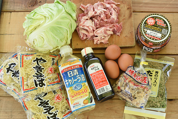 焼きそば麺 3袋、キャベツ 小1玉、豚肉 200g、サラダ油 適量、ソース 適量、肉かす 1袋、魚粉 適量