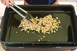 ① 熱した鉄板にサラダ油をひき、細かく刻んだ油かすを炒める